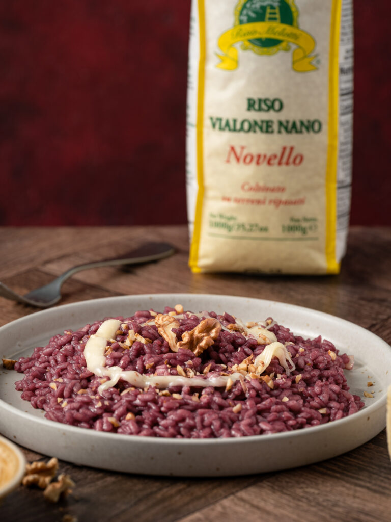 RISOTTO ALL'AMARONE CON CREMA DI MONTE VERONESE E CRUMBLE DI NOCI